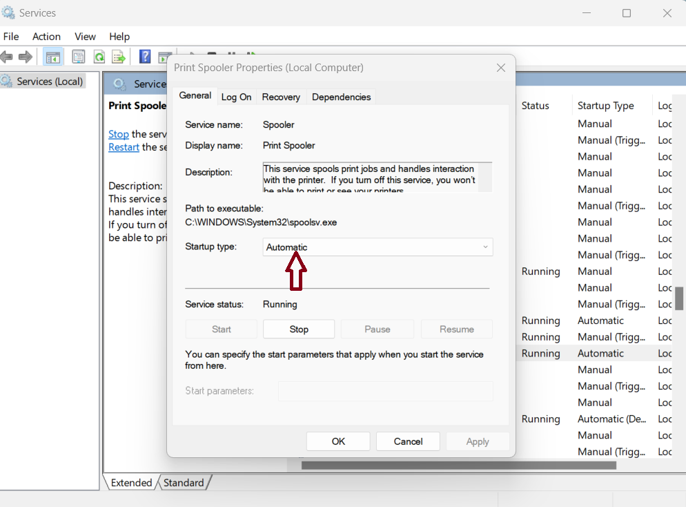 2. Haga clic derecho en Cola de impresión y seleccione Propiedades.