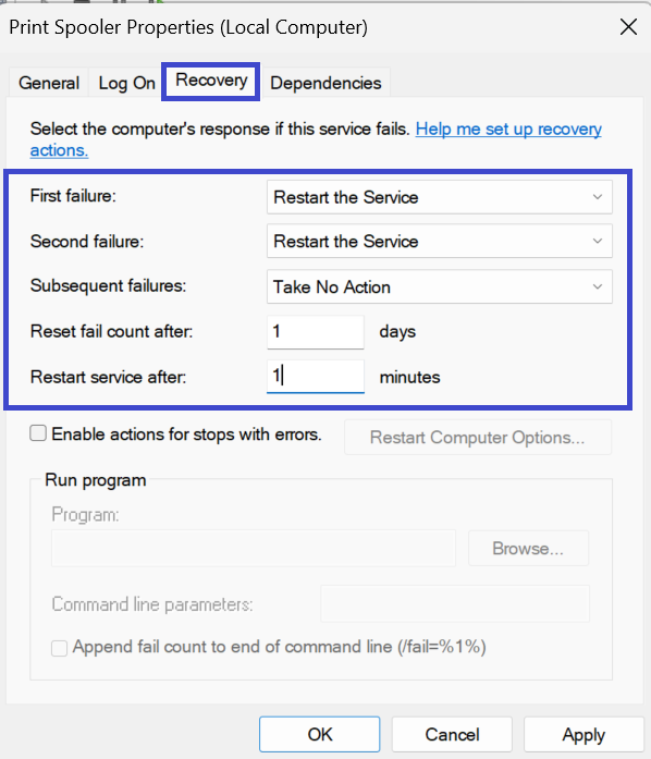 4. Navegue a la pestaña Recuperación (consulte la imagen a continuación). Realice el cambio y haga clic en Aceptar para guardar los cambios.