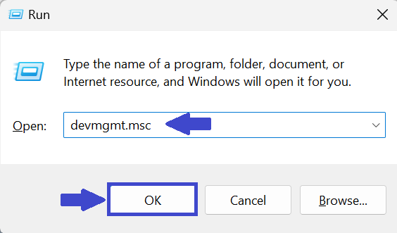 PASO 1:Presione Win + R. Escriba "devmgmt.msc".