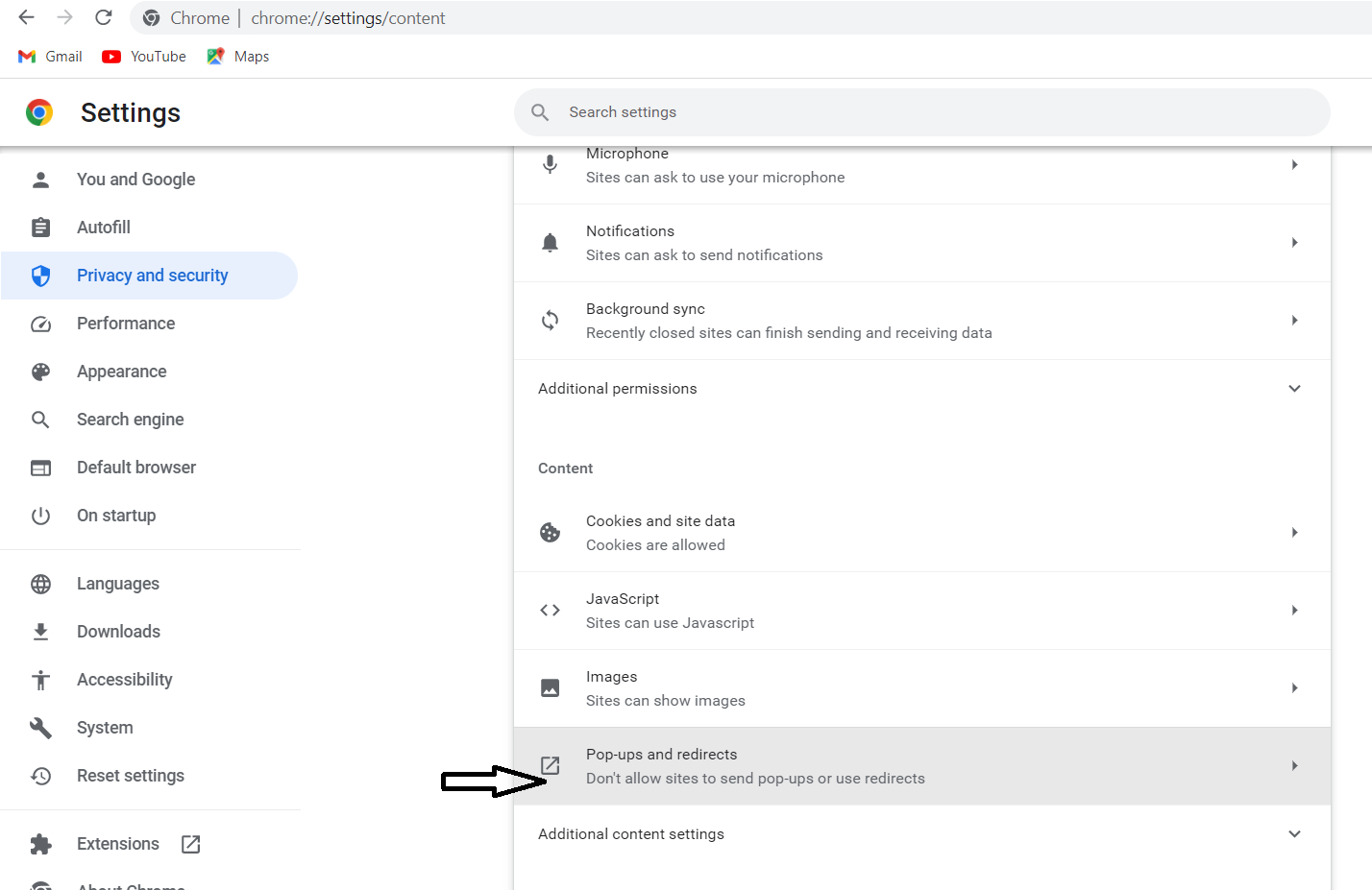 6. Elija la opción "ventanas emergentes y redireccionamiento" después de desplazarse hacia abajo.