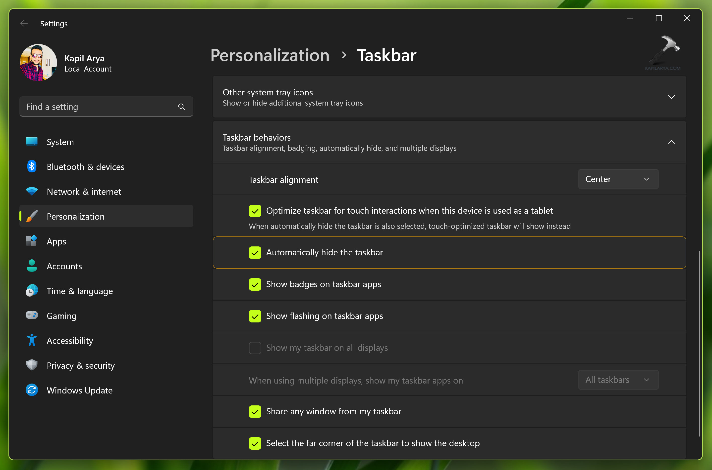 Asegúrese de que la opción de pantallas múltiples esté configurada correctamente, especialmente si está utilizando más de un monitor. AsegurarMostrar mi barra de tareas en todas las pantallasLa opción está activada.
