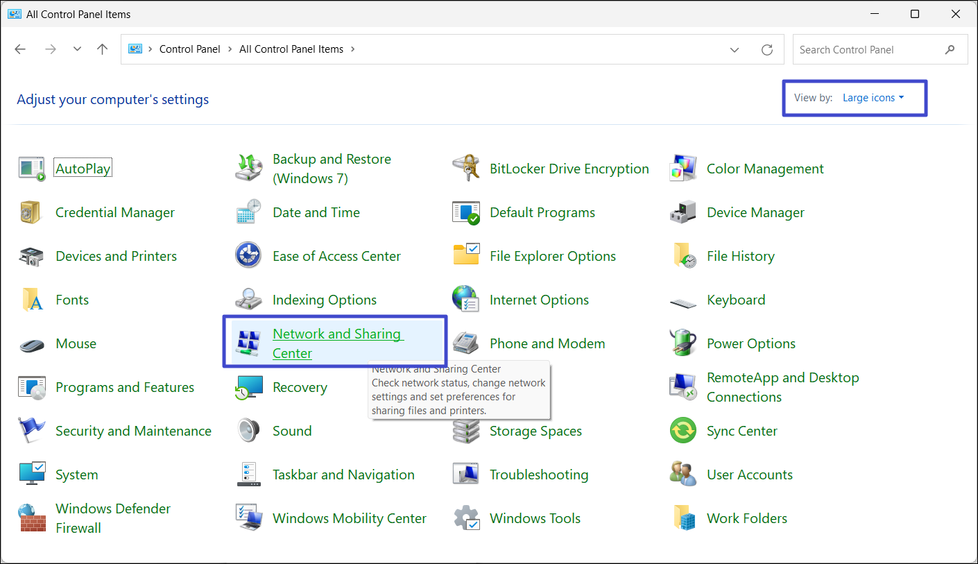 2. Establezca la vista en "Iconos grandes" y seleccione "Centro de redes y recursos compartidos“.