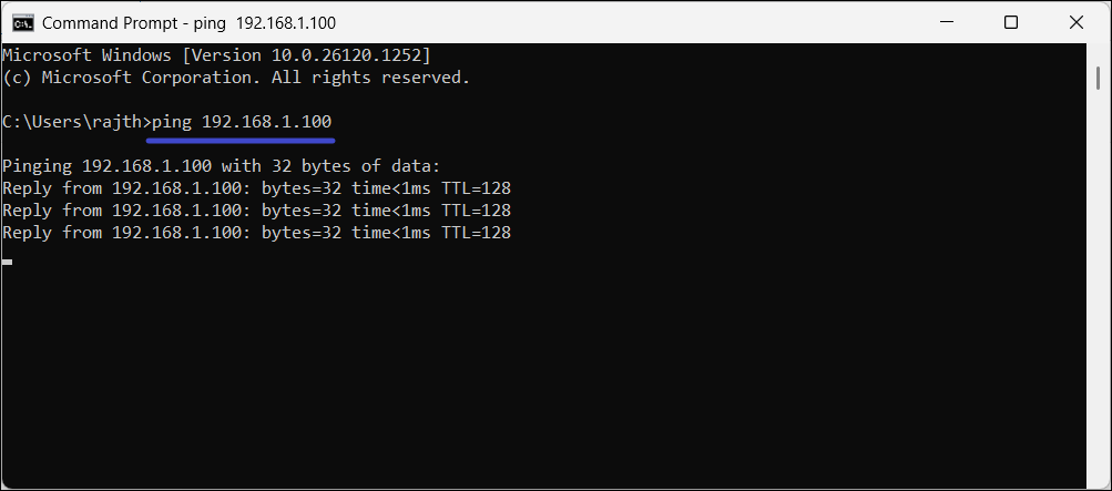 2. En el CMD, escriba "Silbido"seguido de un espacio y luego escriba el DCdirección IPv4anotaste antes. Luego, presione Entrar.
