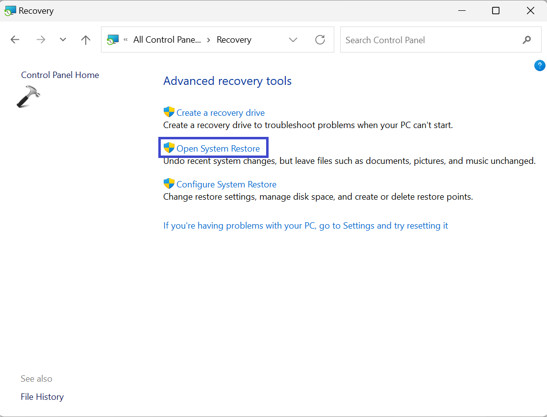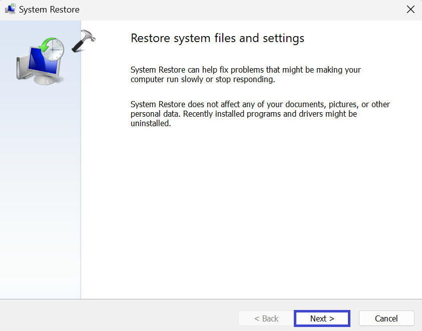 Método 4: Solución: "Hubo un problema al restablecer su PC" al usar Restaurar sistema