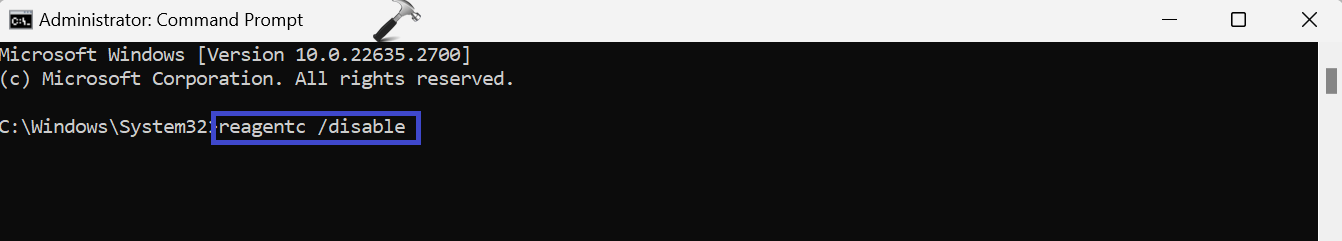 3. Para iniciar nuevamente WinRE, copie y pegue el siguiente comando: