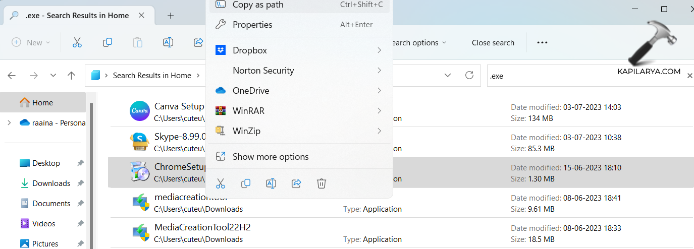 1. Encuentre la ruta del archivo de instalación haciendo clic derecho y eligiendo la opción "Copiar como ruta".