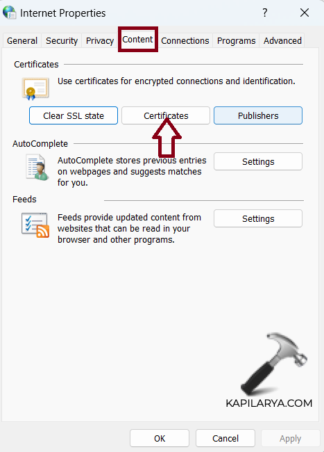 4. Seleccione la pestaña "Contenido" y haga clic en "Certificados".