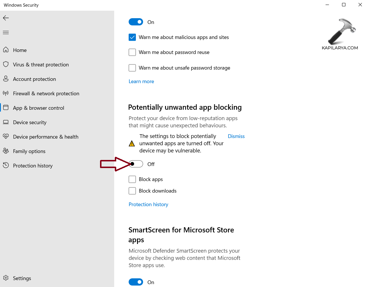 7. Desactive el interruptor de "Bloqueo de aplicaciones potencialmente no deseadas". Haga clic en "Sí" para confirmar.