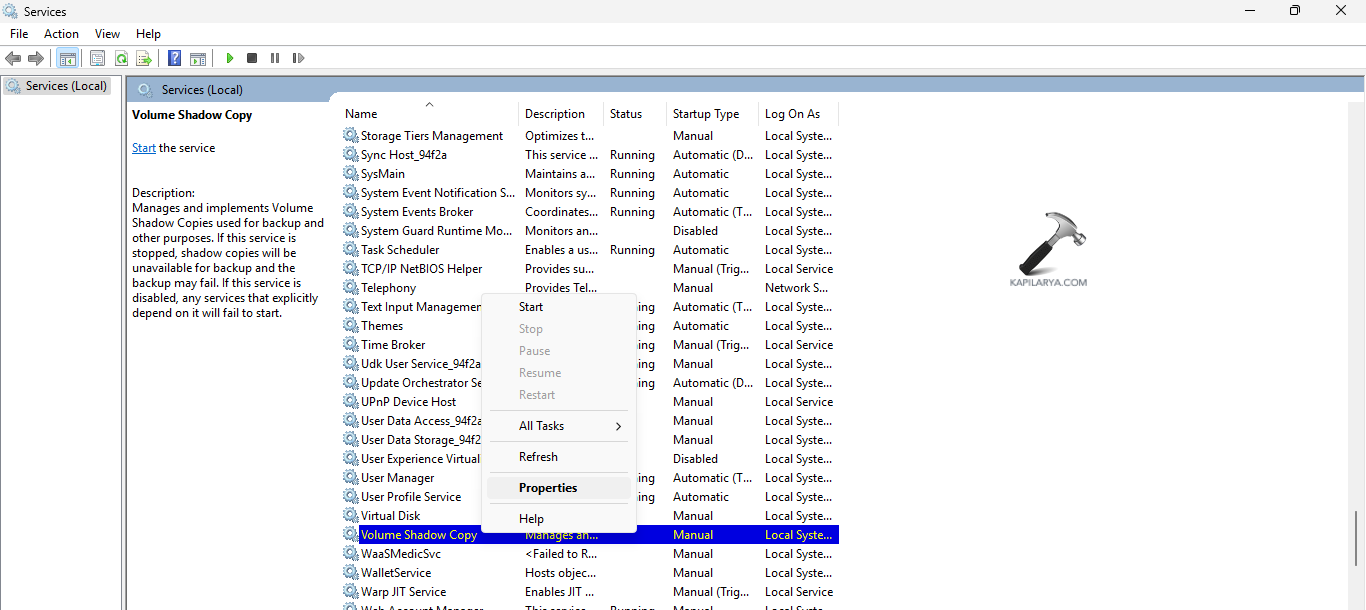 Paso 2-A continuación, en la ventana Servicios, vaya a Servicios de instantáneas de volumen y haga clic derecho.