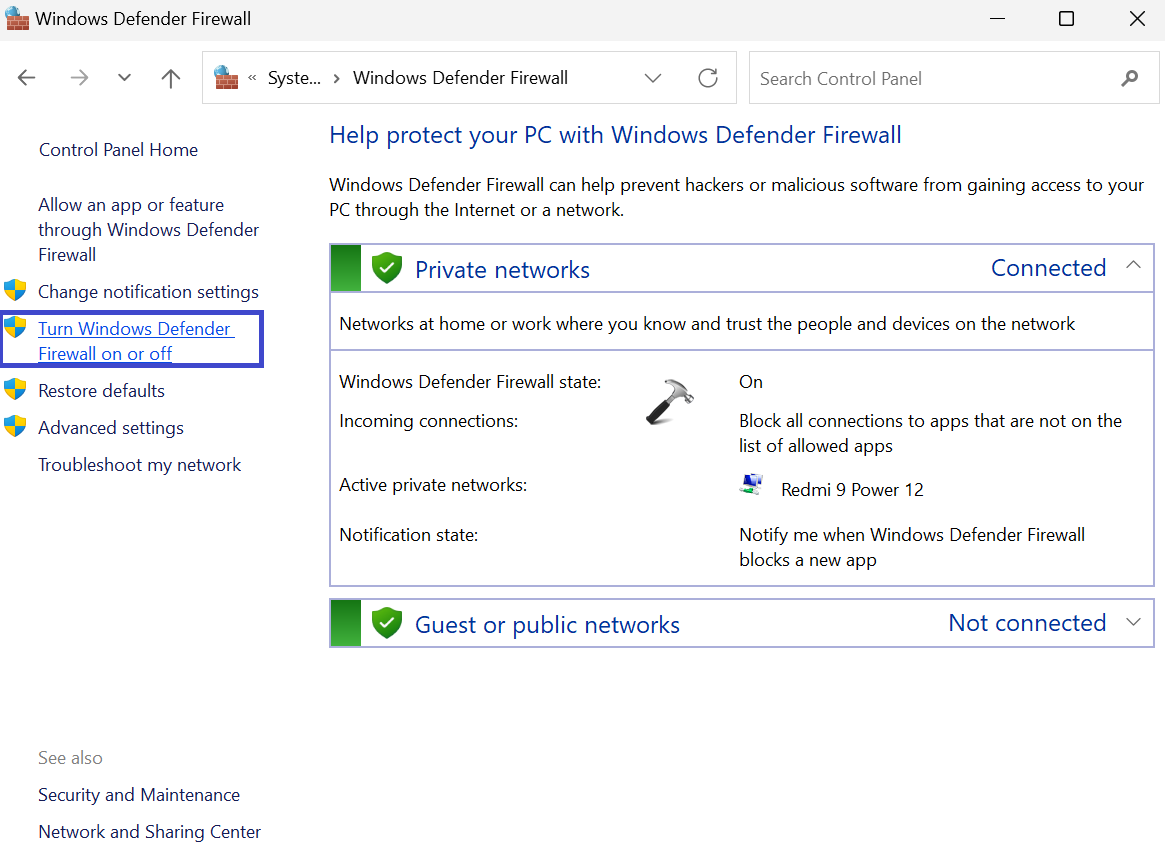 Se utiliza un Firewall para permitir o denegar el acceso a Internet a las aplicaciones. También puede negar el acceso a la instalación de la oficina, lo que puede provocar un error. Deshabilite el Firewall siguiendo los siguientes pasos: