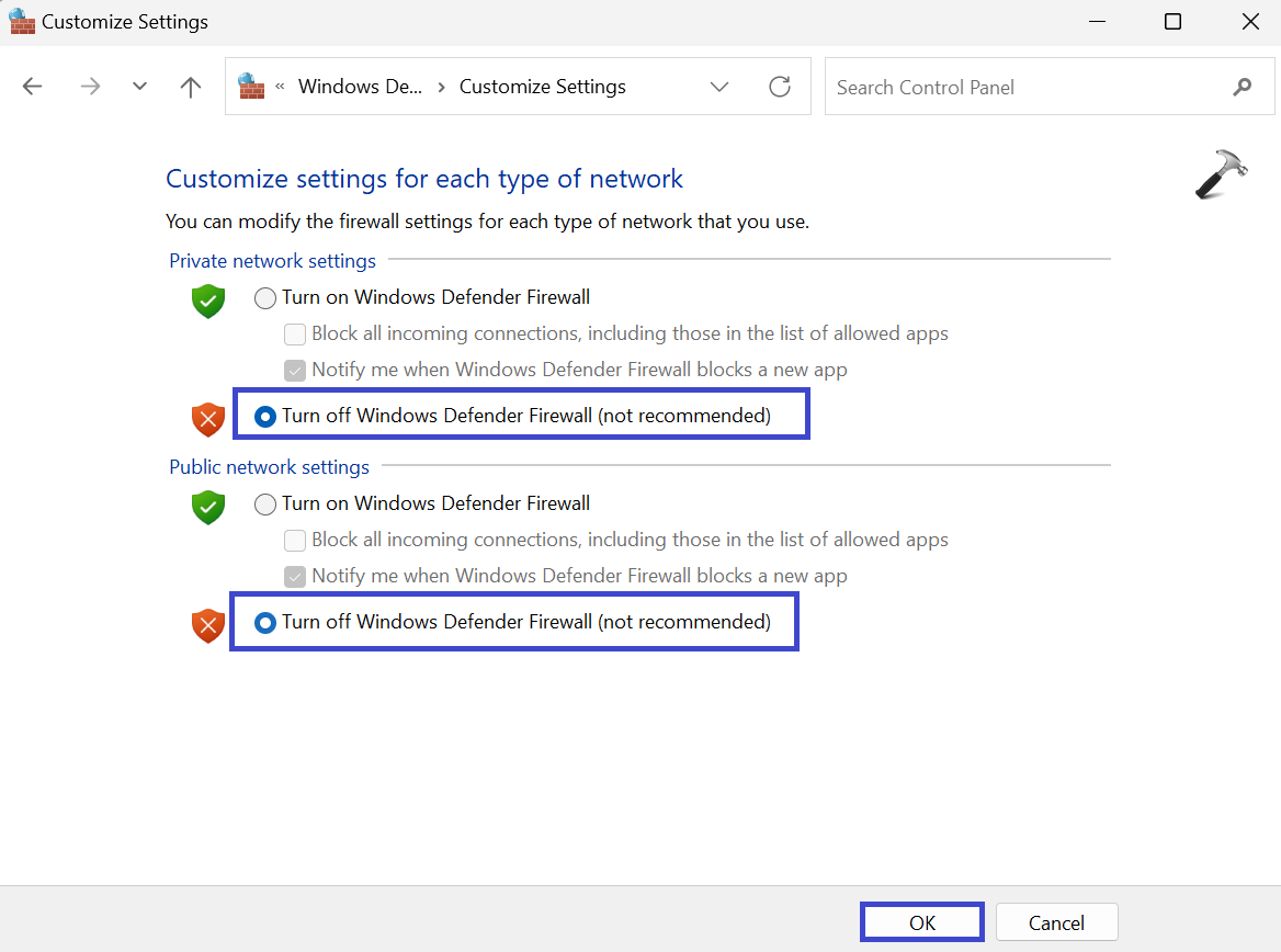 4. Ahora, seleccione "Desactivar el Firewall de Windows Defender".