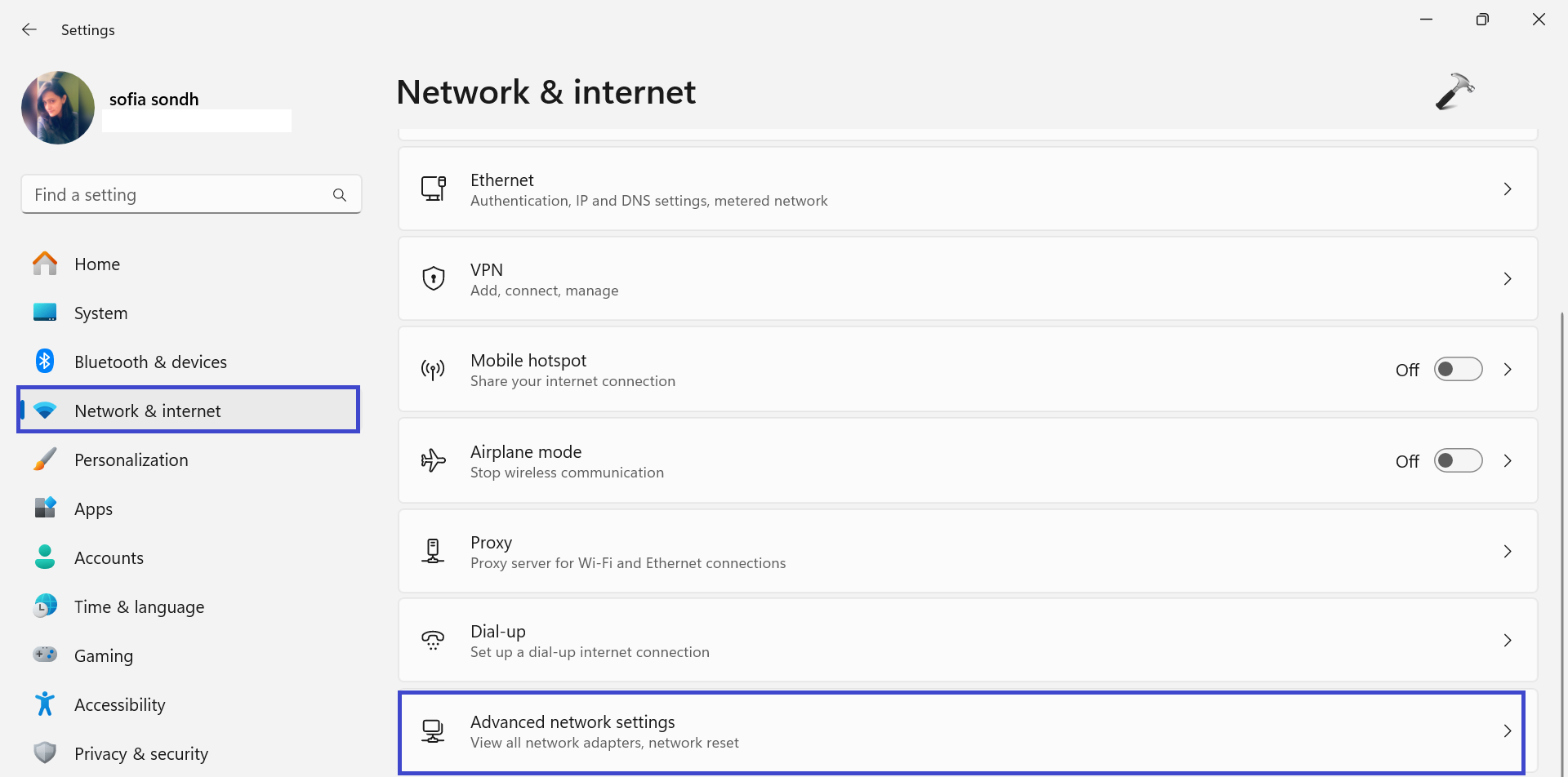 1. Abra la aplicación Configuración. Bajo "Red e Internet“, haga clic en “Configuración de red avanzada" opción.