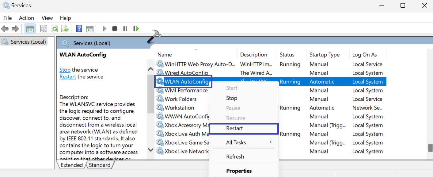 2. Haga clic derecho en "Configuración automática de WLAN"Opción y seleccione"Reanudar“.