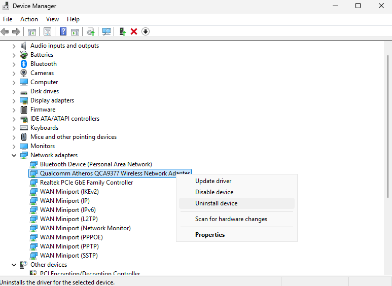 Paso 2-Seleccione Desinstalar dispositivo con un clic derecho en el adaptador inalámbrico.