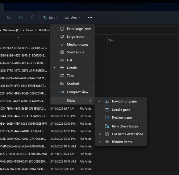 Es posible que algunos de los elementos de la carpeta Temas estén transpirados, por lo que es posible que no los encuentres todos. En ese caso, seleccione “Ver>” y luego “Mostrar”. Elija "Elementos ocultos" en el menú desplegable.