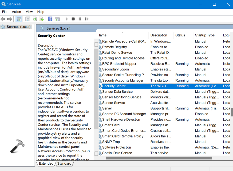 4.Por último, busqueCentro de seguridady comprobar si su estado esCorrer.
