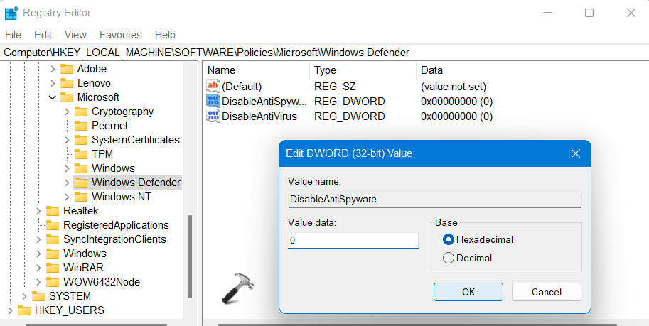 HKEY_LOCAL_MACHINESOFTWAREPoliciesMicrosoftWindows Defender