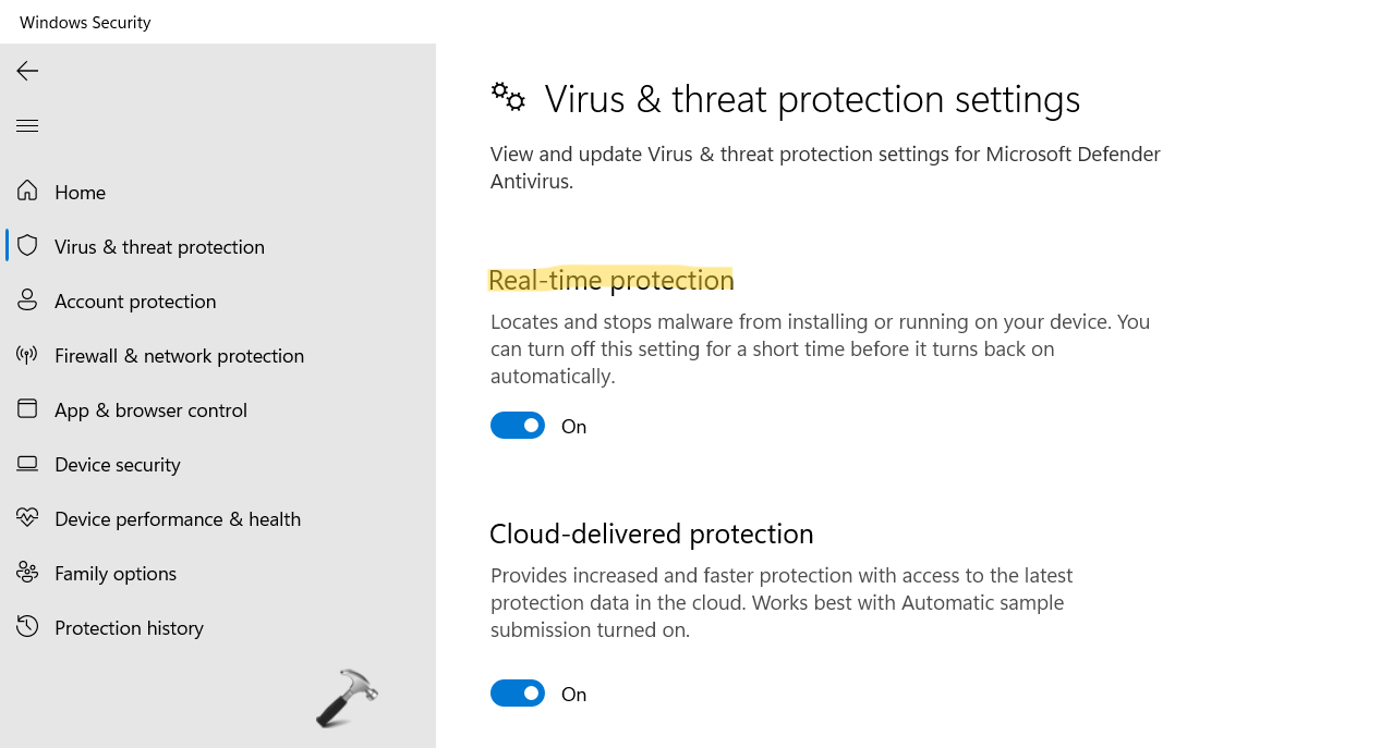 7.Además, en elConfiguración de protección contra virus y amenazas, habilite elProtección en tiempo realgirando su palancaEn.