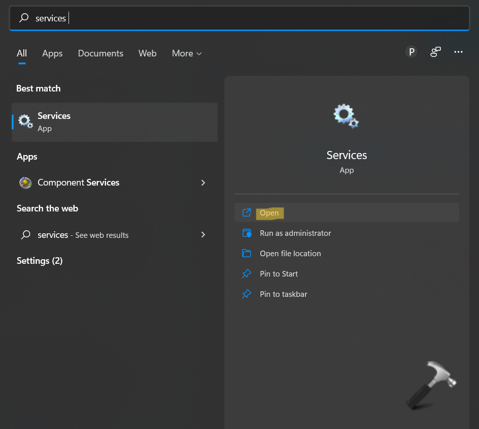 1.En primer lugar, abre elServiciosutilidad a través de WindowsBuscar. TipoServiciosen la columna de búsqueda y haga clic enAbierto.