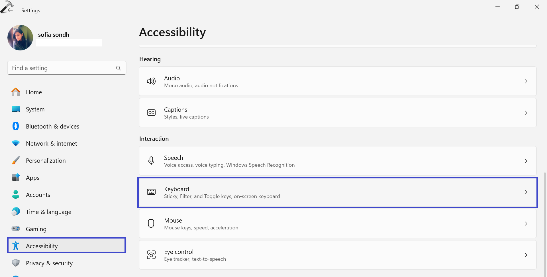 1. Abra la aplicación Configuración y haga clic en "Accesibilidad => Teclado“.