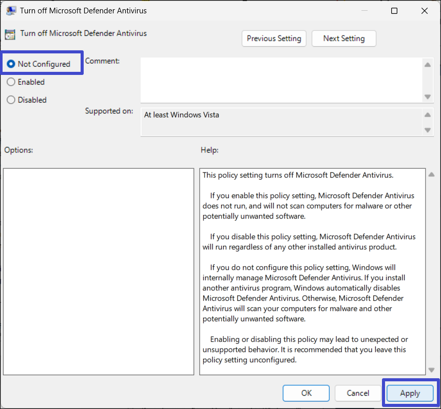 4. Establezca la configuración en "No configurado" y haga clic en "Aplicar“.