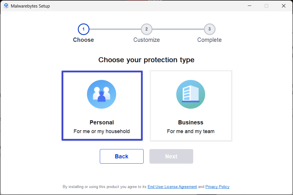 2. Ejecute el archivo de instalación descargado (MBSetup.exe) y siga las instrucciones que aparecen en pantalla para instalar la aplicación. Al instalar, asegúrese de seleccionar "Personal”uso en el paso del tipo de producción.
