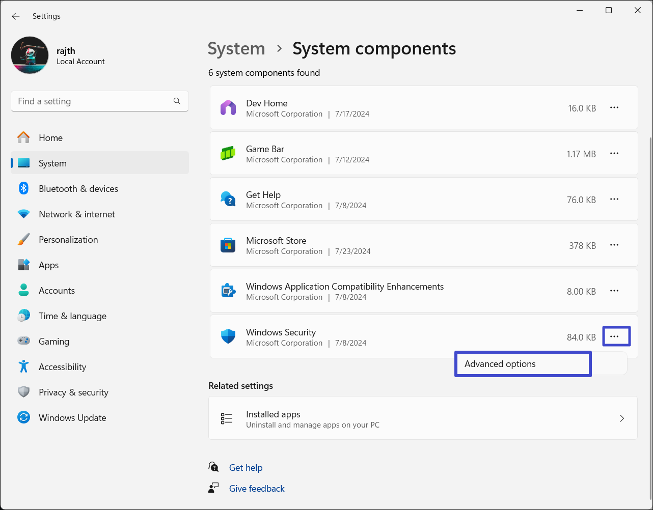 2. Haga clic en eltres puntosjunto a "Seguridad de Windows" y seleccione "Opciones avanzadas“.