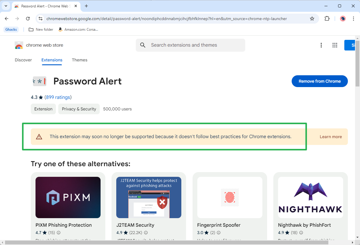 Abra la página Chrome Web Store de la extensión. Si recibe el mensaje "es posible que su extensión pronto ya no sea compatible porque no sigue las mejores prácticas para las extensiones de Chrome". cerca de la parte superior de la página, se desactivará a menos que el desarrollador lo actualice.