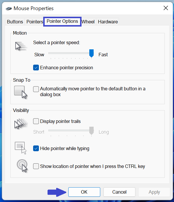 PASO 3: En la ventana Propiedades, vaya aOpciones de punteropestaña.