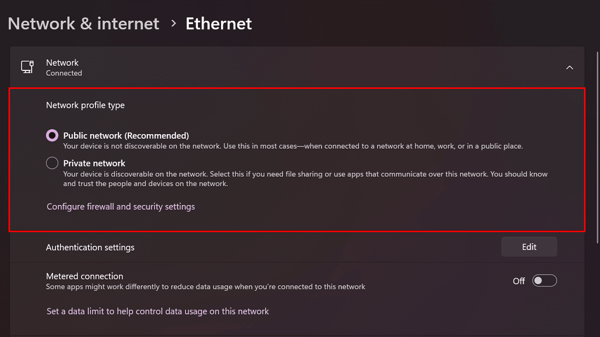 - Bajo el “Tipo de perfil de red”, seleccione el tipo de perfil, incluidoPúblicooPrivado.