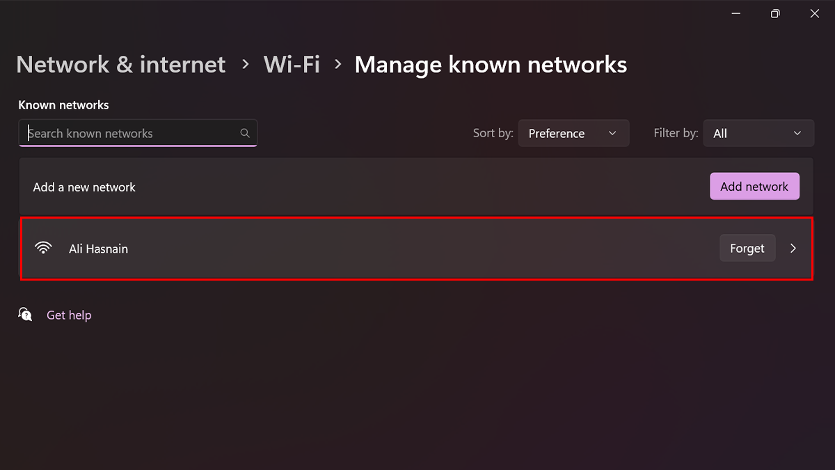- Haga clic enAdministrar redes conocidasconfiguración.