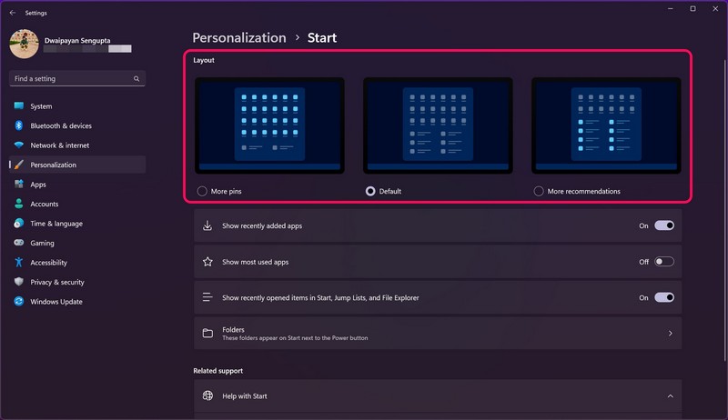 De esta manera, puede cambiar fácilmente el diseño predeterminado del menú Inicio de Windows 11 para mostrar más aplicaciones ancladas o más archivos recomendados. Esta función es bastante útil si desea personalizar el menú Inicio de Windows 11 en su PC o computadora portátil para obtener una mejor experiencia de usuario.