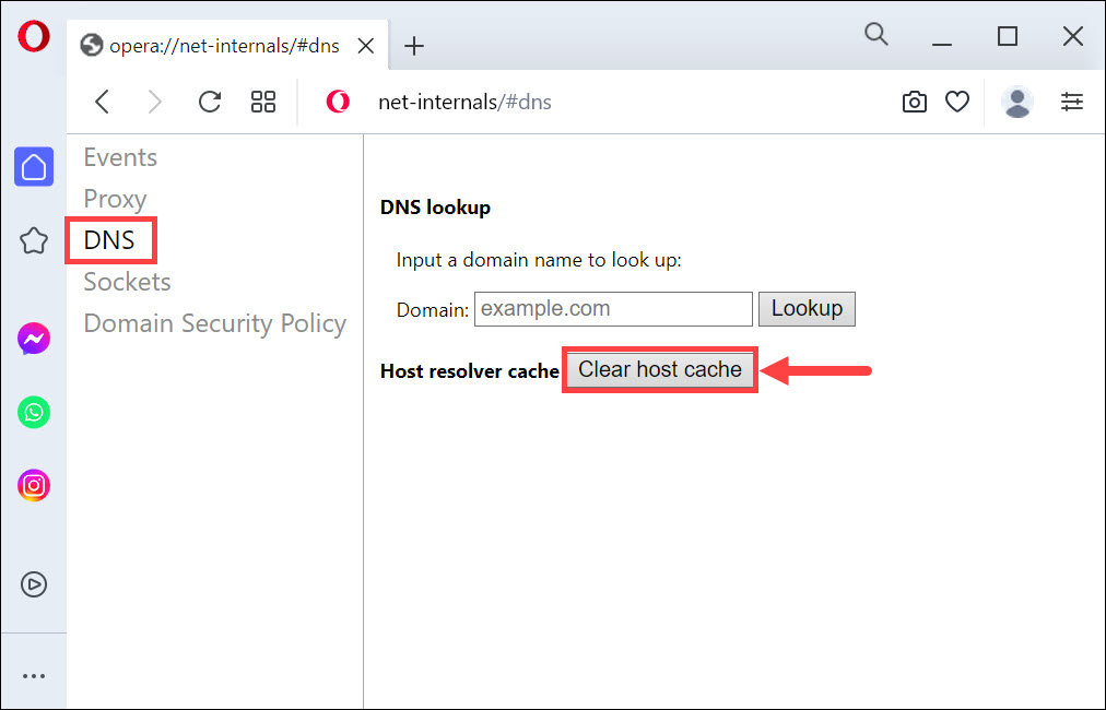 2.Ingresar "opera://net-internals/#dns”en la barra de direcciones y presiona enter.