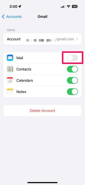 5.En la siguiente página,toca el interruptorpara elCorreoaplicación para deshabilitar la cuenta seleccionada para correos electrónicos.