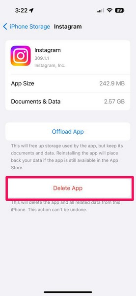 7.Ahora, si abro la página de almacenamiento para elInstagramaplicación en mi iPhone, notarás que aunque la aplicación en sí es pequeña, laDocumentos y datosel almacenamiento esbastante alto. Estos son los tipos de aplicaciones que querrás desinstalar y luego reinstalar.