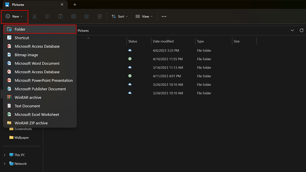 - Haga clic enNuevomenú y seleccione elCarpetaopción.