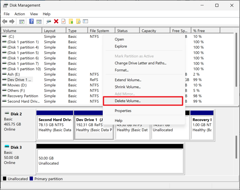 2. En la herramienta Administración de discos, busque y haga clic derecho en la unidad de desarrollo. Luego, seleccione “Eliminar volumen" o "Desconectar VHD“.