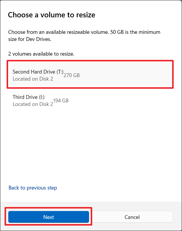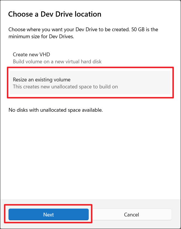 Puede cambiar el tamaño de un volumen de Dev Drive si hay al menos 50 GB de espacio en la unidad virtual. Para aumentar su tamaño más allá de eso, deberá crear una unidad de desarrollo nueva y más grande. Si es una unidad física, puede cambiar su tamaño a cualquier tamaño dentro del espacio disponible en esa unidad.