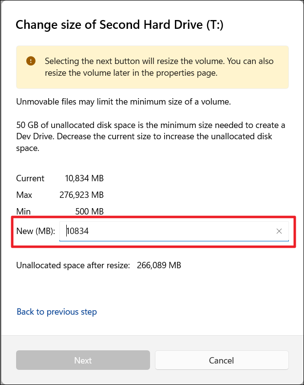 6. Especifique el nuevo tamaño en megabytes y haga clic en "Próximo“.