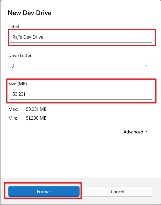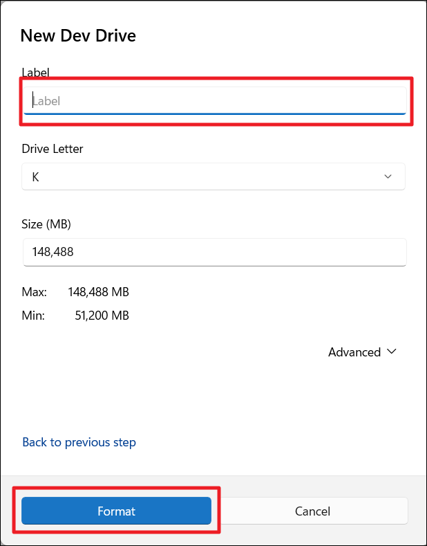 7. Asigne una etiqueta y haga clic en "Formato". El tamaño de Dev Drive cambiará al nuevo volumen.