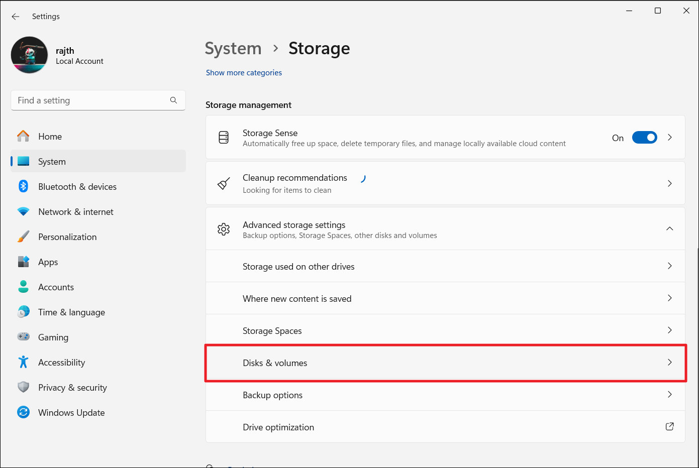 3. BajoGestión de almacenamiento, elegir "Configuración de almacenamiento avanzada”y haga clic en “Discos y volúmenes”.