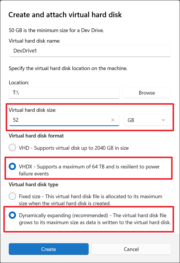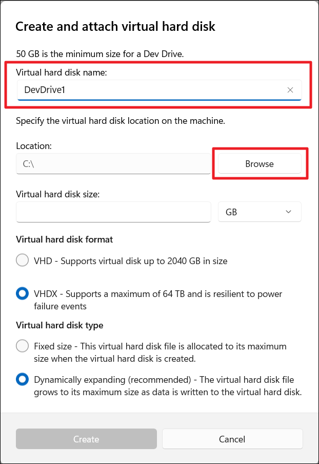 8. Elija el formato del disco duro virtual como "VHDX: admite un máximo de 64 TB y es resistente a eventos de fallas de energía" y establezca el tipo en "Expandiendo dinámicamente (recomendado)", lo que permite que la unidad crezca a medida que se agregan más datos. Una vez que haya realizado estas selecciones, haga clic en "Crear". Si el botón está deshabilitado, intente cambiar a una unidad diferente como ubicación.