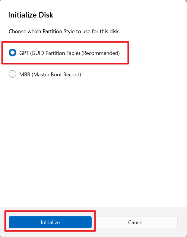 9. A continuación, elija el estilo de partición y haga clic en "Inicializar". El estilo de partición recomendado esGPT (tabla de particiones GUID).