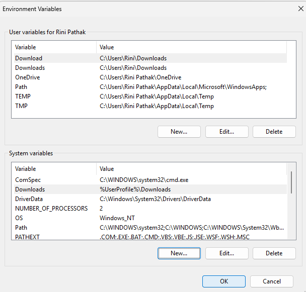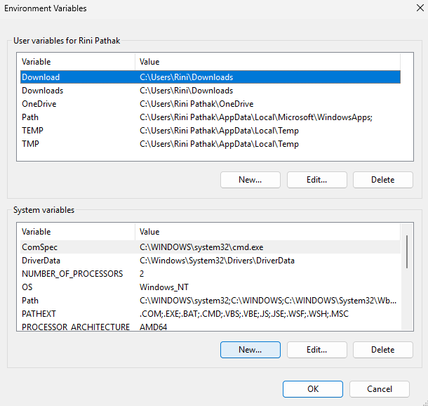 Paso 3-Ahora, debajo de la sección superior Variables de usuario <nombre de usuario actual>, seleccione la opción Nueva.