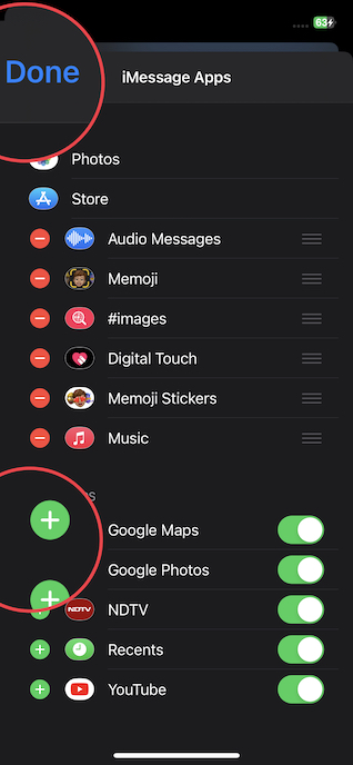 - Una vez que haya personalizado el cajón de aplicaciones en la aplicación Apple Messages en su dispositivo iOS o iPadOS, asegúrese de tocarHechoen la esquina superior izquierda de la pantalla para finalizar.