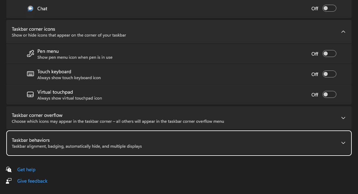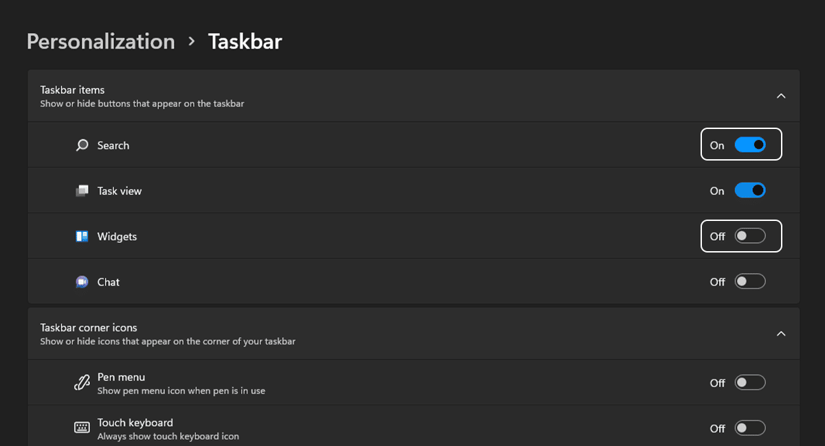 - En la configuración de la barra de tareas, puedes desactivar los íconos predeterminados no deseados y dejar los que usas activados.