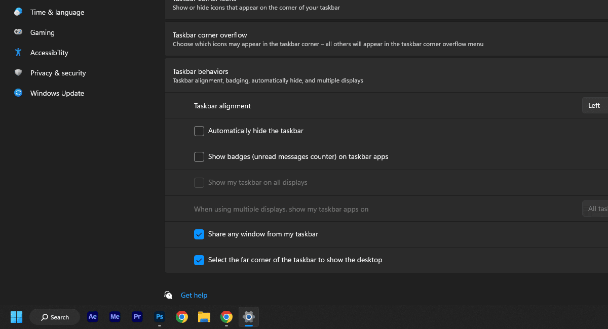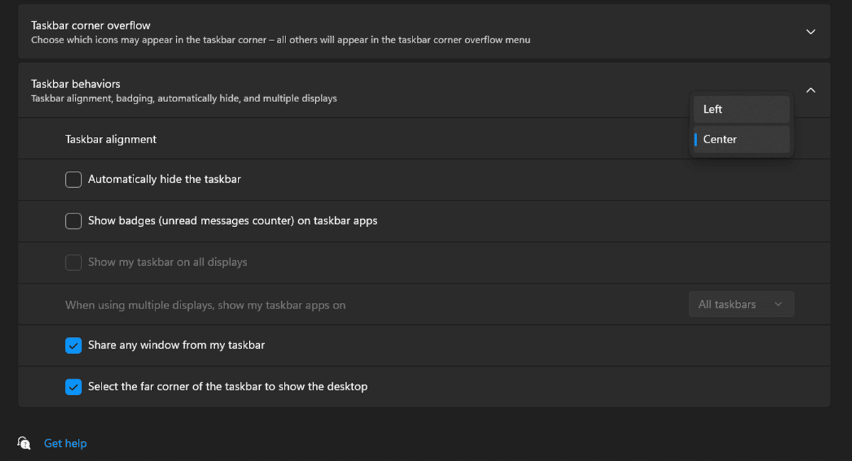 - Con la alineación de la barra de tareas, cambia el lugar del ícono de la barra de tareas a la izquierda o puede mantenerlo en el centro tal como está.