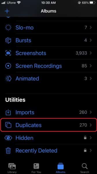 - Deslízate hacia abajo y tocaDuplicadosbajo elUtilidadessección.