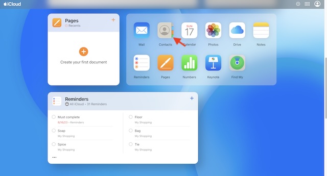 6.Una vez que haya iniciado sesión con éxito en su cuenta de iCloud, desplácese hacia abajo y haga clic en elAplicación de contactosicono.