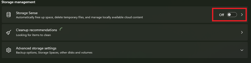 3.En Gestión de almacenamiento, habilite el interruptor junto aSentido de almacenamiento.